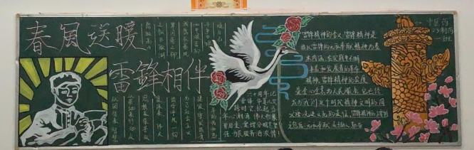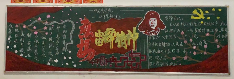 为弘扬雷锋精神,彰显时代担当,践行文明校园创建活动,进一步加强学生的思想道德建设,展现我校师生良好的精神风貌。在“学雷锋活动月”来临之际,学院团委组织开展“春风送暖,雷锋相伴”主题黑板报评比活动。
