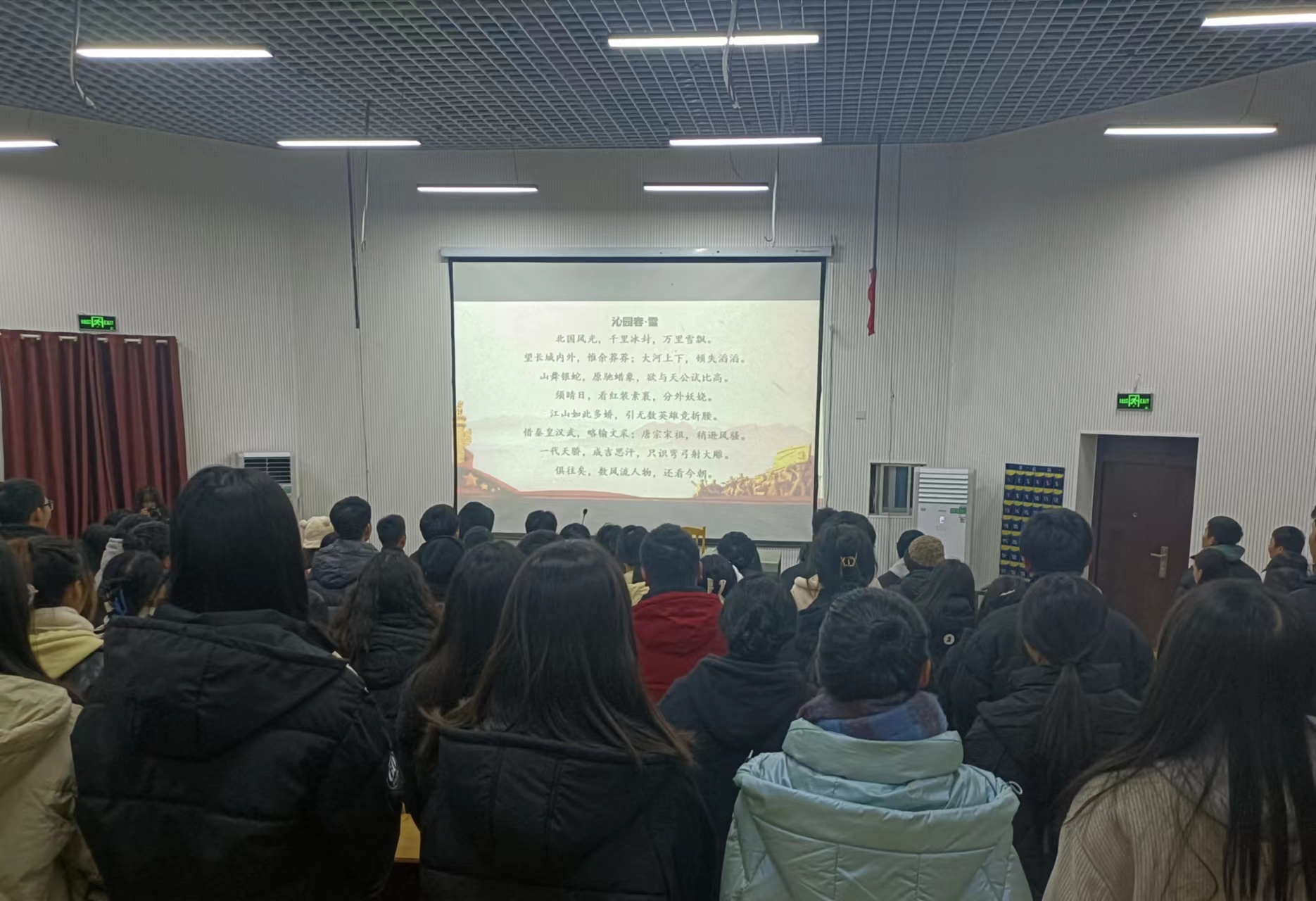为纪念毛泽东同志诞辰130周年,增进广大同学对毛泽东诗词的了解与认识,2023年12月17日,学院组织青马工程学员在第一多媒体开展以“诵读伟人经典,感悟红色情怀”为主题的诵读分享会。