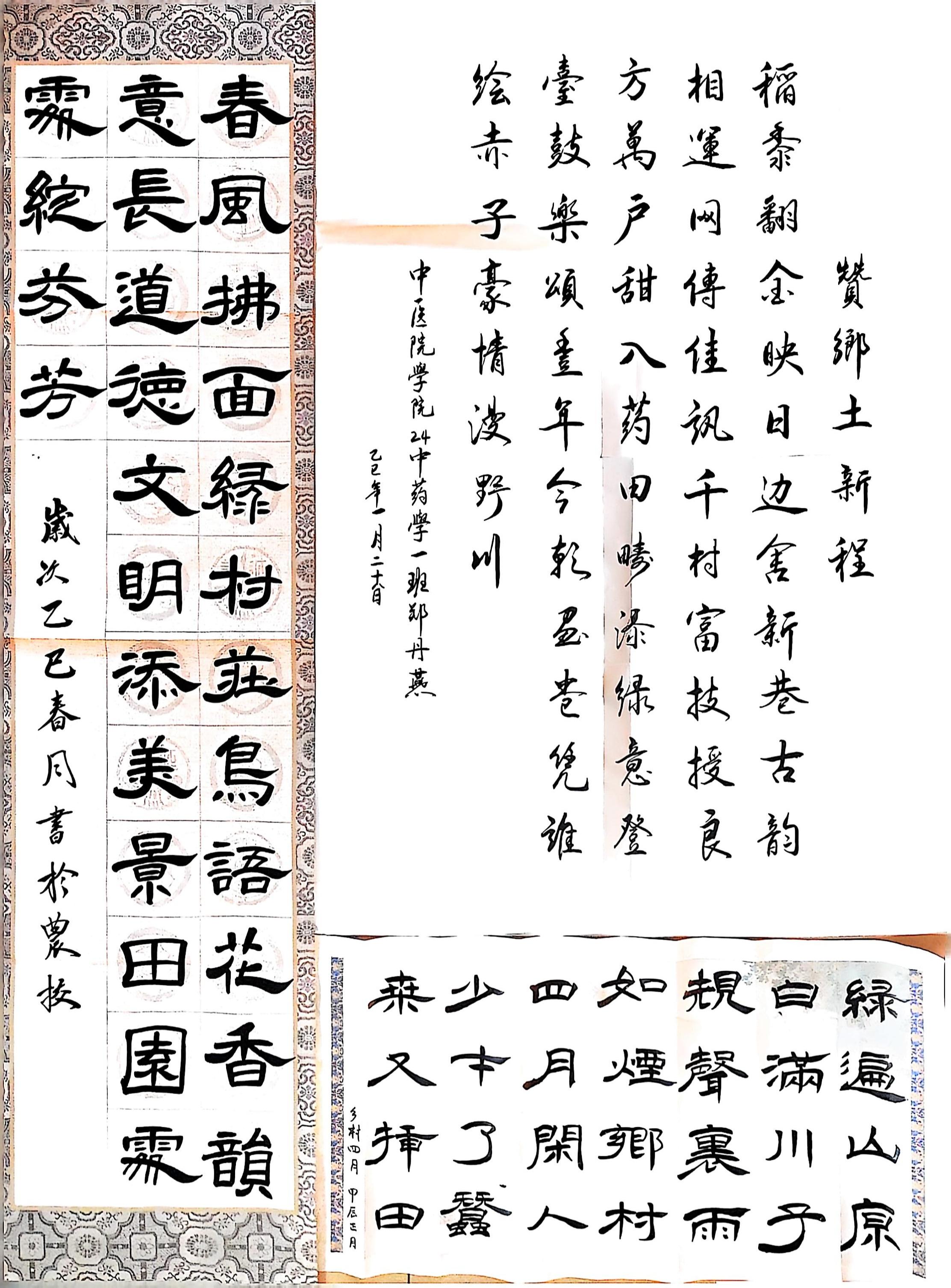 在创作书法作品的时候,同学们用诗的语言,一笔一画,讲述乡村故事。吴雨珏同学以乡村春景创作《和美乡村行》。曾慧同学传承乡土文化,书录南宋诗人翁卷《乡村四月》,字里行间,满满都是乡村的四月天,是农人的勤劳,是农事生活的美。郑丹燕同学写下《赞乡土新程》,书写家乡农业产业发展及运用农技致富的新成就。