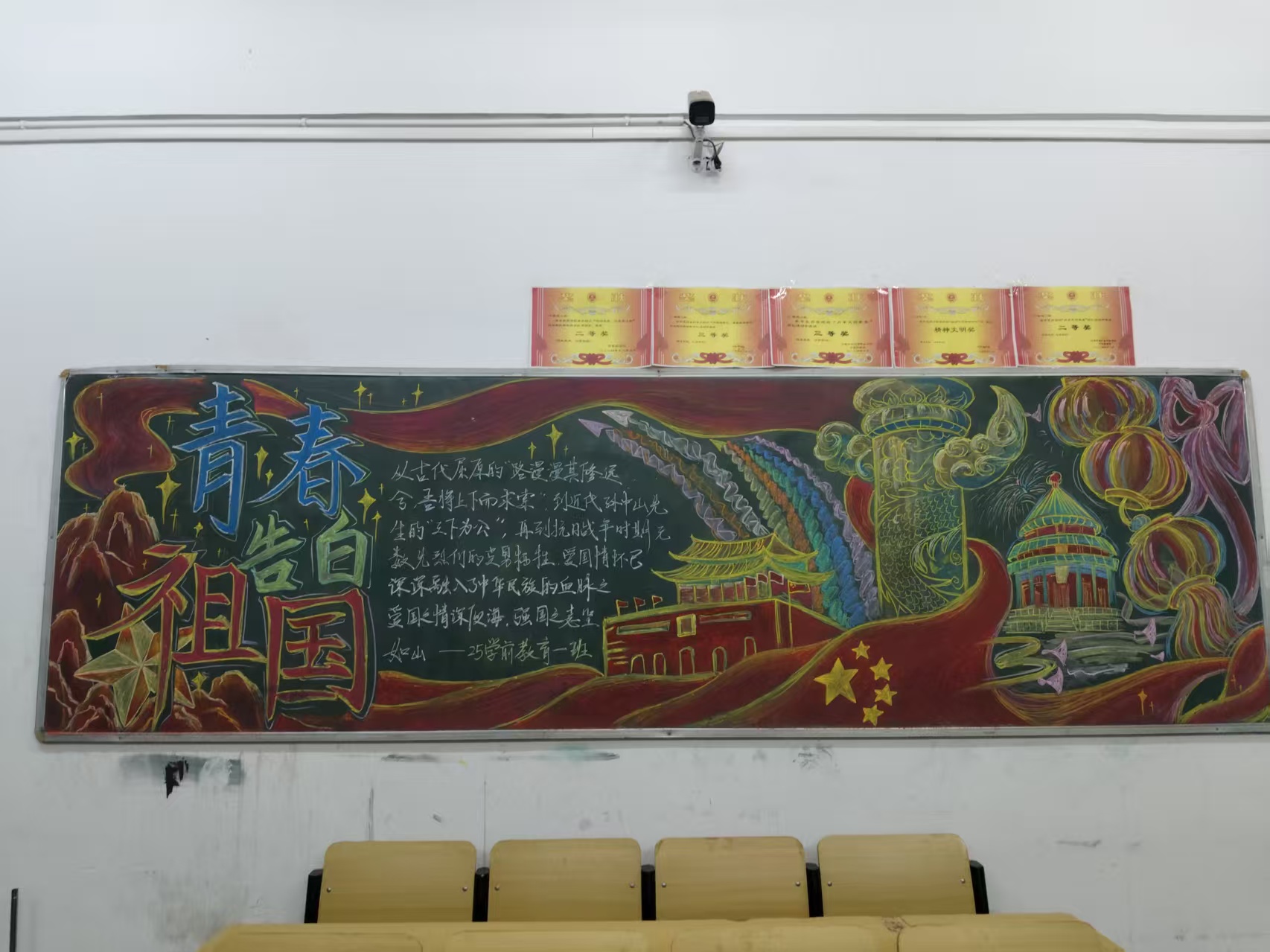 本次黑板报评比活动,既提升了同学们的团队协作能力,又进一步深化了同学们的爱国热情,强化了同学们的理想追求,促使个人理想与国家信念紧密融合,将同学们对祖国的热爱转化为前进动力,激励同学们为实现中国梦贡献青春力量。