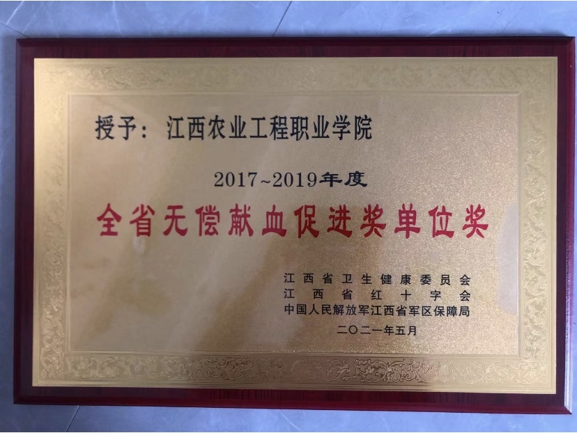 2021年6月13日,正值世界献血日到来之际,我院荣获江西省卫健委、红十字会颁发的2017-2019年度“全省无偿献血促进奖单位奖”,该奖项不仅是对我院献血工作的充分肯定,也将激励更多学子积极参与献血活动当中来。