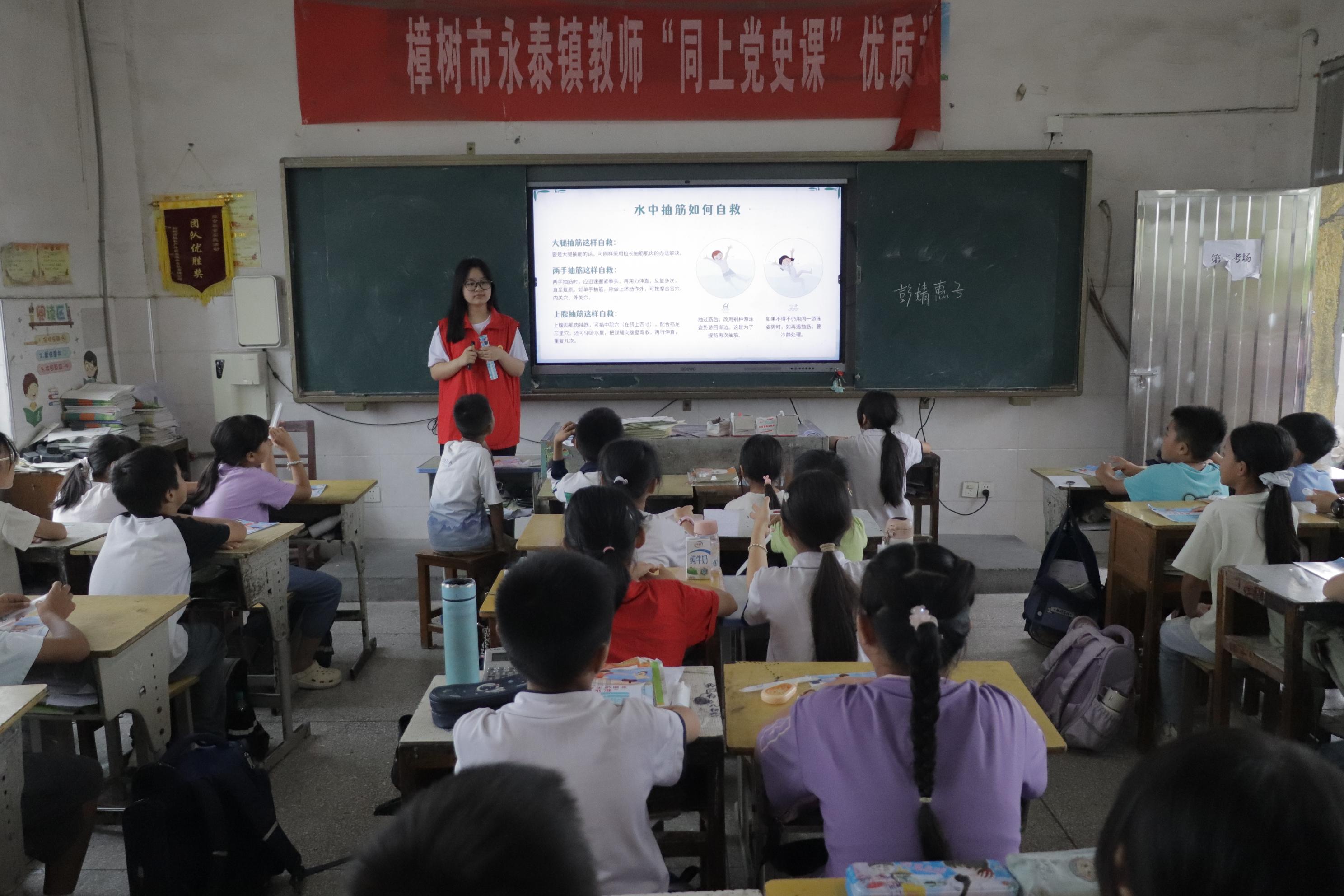 活动当天,在永泰镇文明实践站的协调安排下,师生们来到永泰镇中心小学。他们运用专业知识和创新能力,制作了图文并茂的PPT和生动视频,为小学生们呈现了一场独特的防溺水知识课堂。学生志愿者们通过案例分析、步骤讲解,深入浅出地传授防溺水知识,让孩子们认识到溺水的危险,并学会科学预防溺水事故。