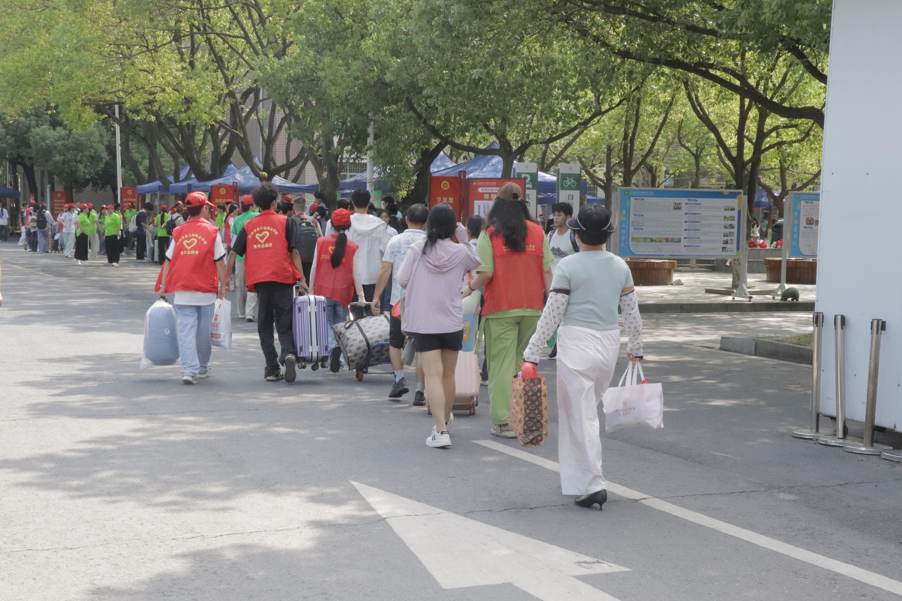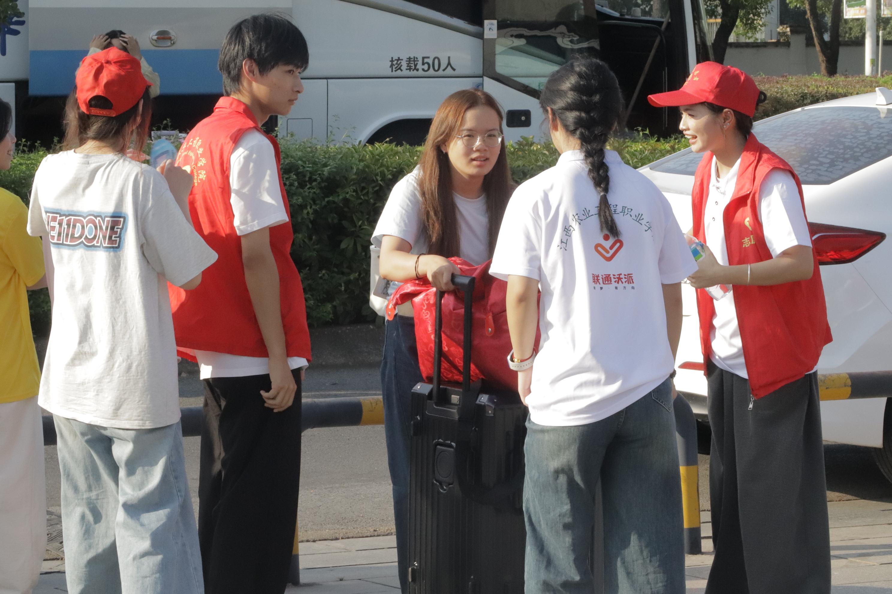 清晨7时20分,志愿者全员到岗值守。伴随新生陆续抵达,身着红色马甲的志愿者坚守于校门路口、报到区域、宿舍楼栋等岗位,以饱满的精神状态迎接每位新生。当新生及家长抵达时,志愿者主动上前协助搬运沉重行李,引导至登记处,并全程陪同办理入学登记、军训服领取及行李安置等手续,既提升了报到效率,亦彰显了学院的人文关怀。随后,志愿者沿途详细介绍图书馆、食堂、操场等设施的方位与功能,助力新生快速熟悉校园环境。全过程充分展现了志愿者积极进取的精神风貌与奉献意识,传递了新时代青年的责任担当,更体现了学院深厚的育人底蕴与优良学风。