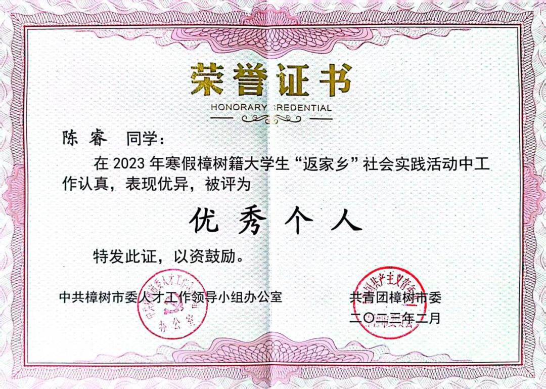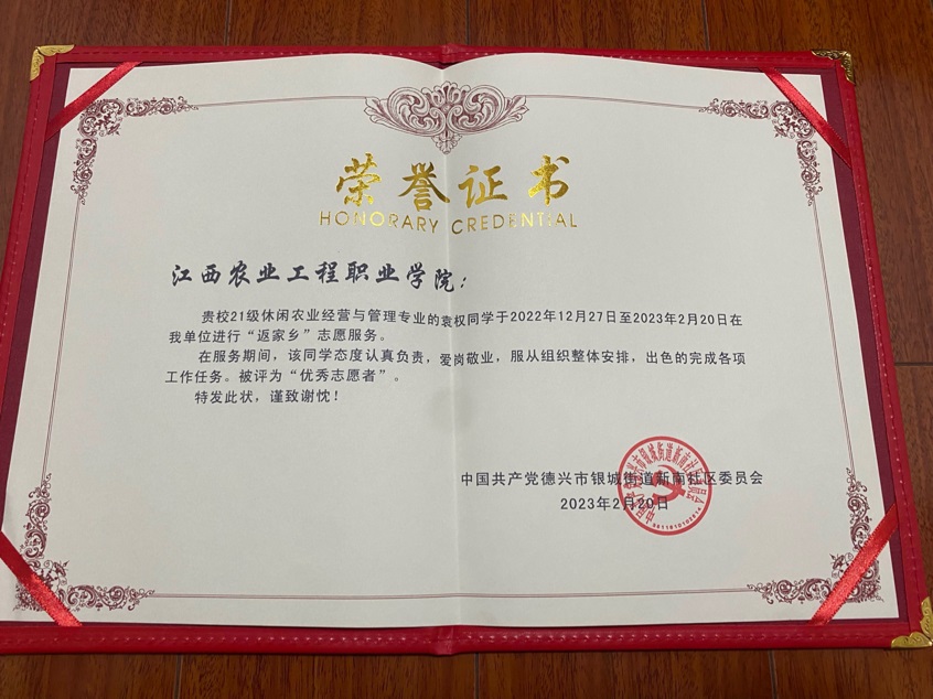在2023年2月,我被村民推选评为“优秀大学生志愿者”。这次的社会实践让我收获很多,真正地意识到大学生志愿服务实践的必要性。要在实践中把握自己,做到“读万卷书,行万里路”,这才叫——知行合一;也更加让我坚信:象牙塔里的我们并非两耳不闻窗外事,一心只读圣贤书,年轻的我们拥有绚丽的青春年华,走出校园,踏上社会,我们仍会交上一份满意的答卷。总之,这个寒假的社会实践是丰富而有意义的,这不仅是一次实践,更是我人生中的一次经历和一生宝贵的财富!