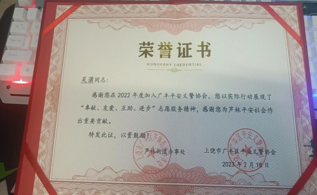 我是来自生物工程学院2021级建筑工程专业的吴潇。我性格开朗,善于沟通,自信大方,具有强烈的正义感,为此我积极响应学校号召,向当地团委报到,参加返家乡活动,随后被分配到街道办“上饶市广丰区义警协会”的当地派出所。