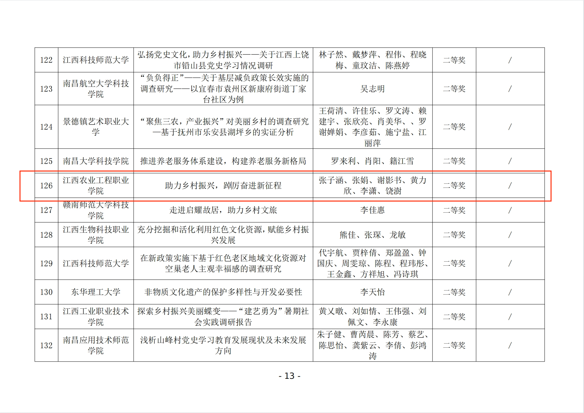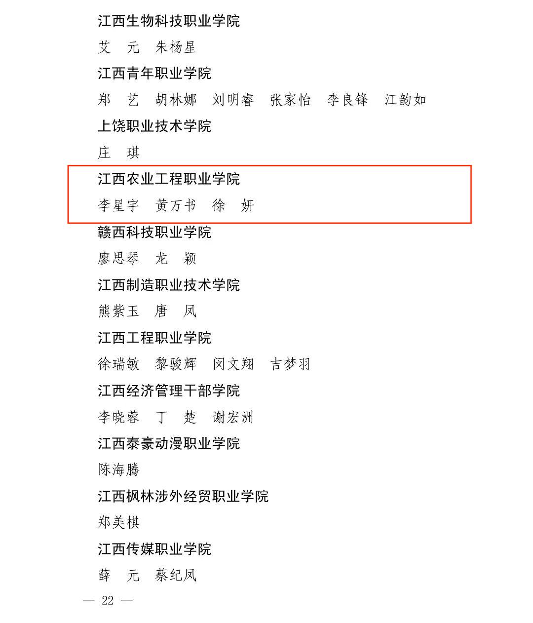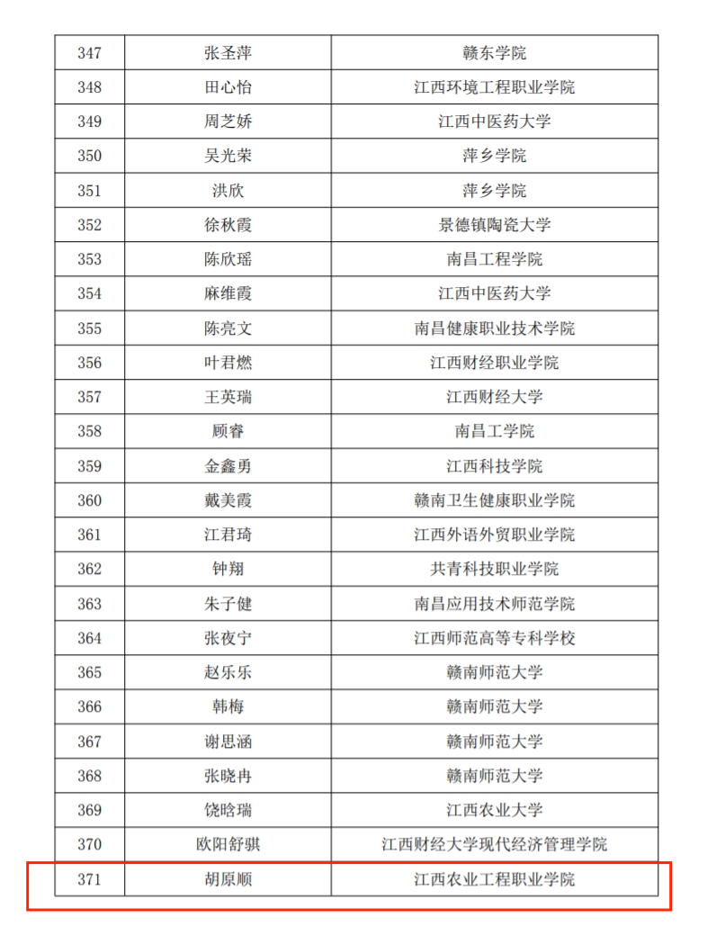 12月12日,中共江西省委宣传部、江西省文明办、江西省教育厅、共青团江西省委、江西省残疾人联合会、江西省学生联合会公布《关于2023年江西省大中专学生志愿者暑期“三下乡”社会实践活动的通报》。其中,我校三下乡社会实践服务团获得省优秀团队称号,我校李星宇、黄万书、徐妍三人获得省优秀个人称号。在“强国有我、青春有为”暑期社会实践活动中,我校胡原顺获得省优秀个人称号,张子涵、张娟等6人撰写的《助力乡村振兴,踔厉奋进新征程》获得优秀调研报告二等奖。
