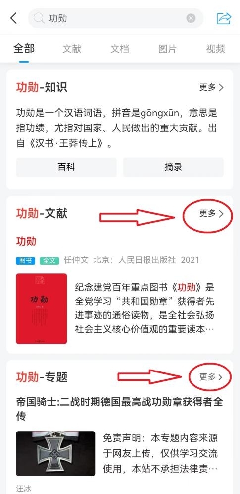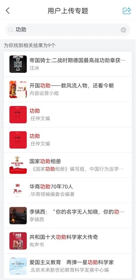 ①进入首页后,在“资源检索”模块中搜索书名或作者(例:书名《功勋》),在两个模块中会有显示,根据电子图书后期加工的情况显示在不同位置:文献、专题两个模块;