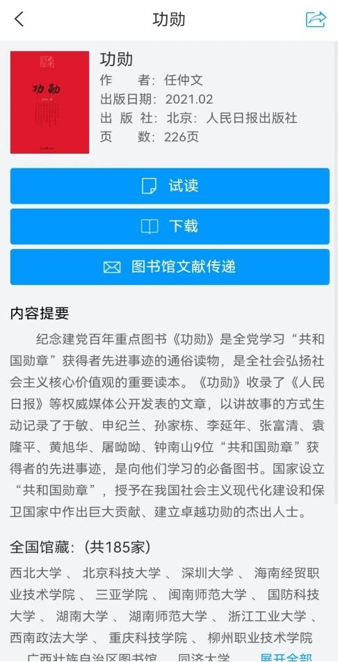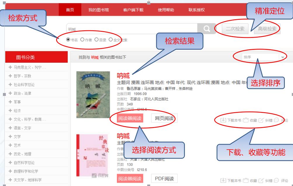 - 文献模块阅读及下载:试读、下载(下载到图书馆界面“下载”处)、文献传递(传递到个人邮箱)