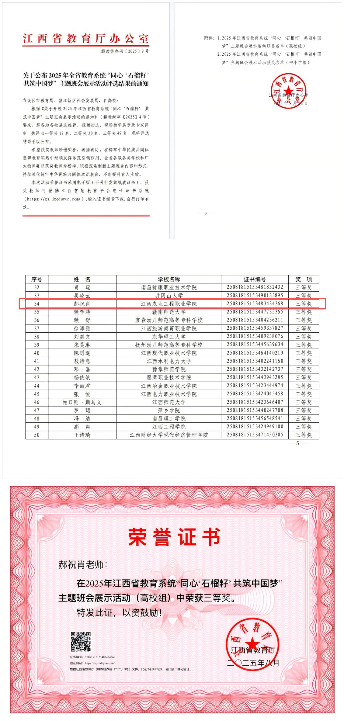 近日,由江西省教育厅主办的2025年全省教育系统“同心‘石榴籽’,共筑中国梦”主题班会展示活动评选结果揭晓。学院青年教师郝祝肖凭借其精心设计的主题班会作品,在与全省众多本科、高职院校优秀辅导员(班主任)的同台竞技中脱颖而出,荣获高校组三等奖,为学院赢得了荣誉。