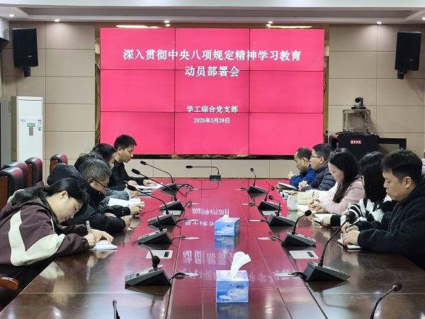 3月28日,学工综合党支部召开深入贯彻中央八项规定精神学习教育动员部署会,认真学习贯彻习近平总书记关于深入贯彻中央八项规定精神学习教育的重要讲话和重要指示精神,传达中央、省委、省委教育工委、学院党委的相关会议精神,学习学院党委《关于开展深入贯彻中央八项规定精神学习教育的工作安排》以及学院主要领导在动员部署会上的讲话精神,并对支部学习教育工作进行部署。