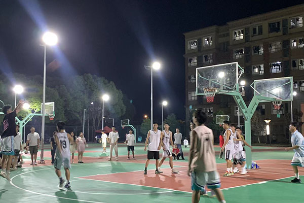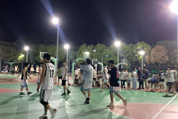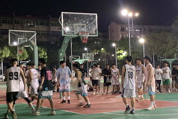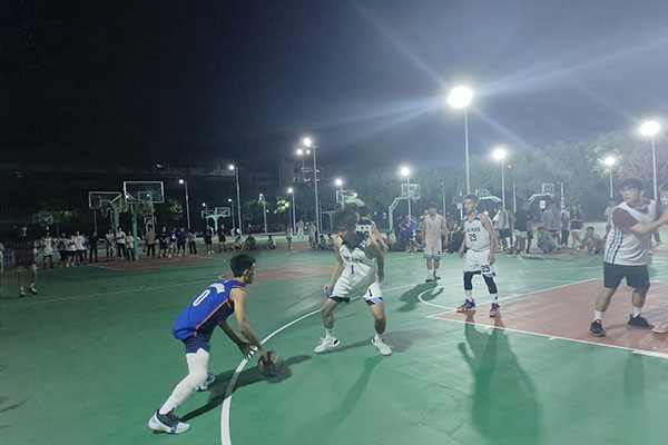 晚上的篮球场格外热闹,耳边不时传来激动的呐喊声,挥洒汗水的少年们、加油助威呐喊的啦啦队,都在灯光的映衬下成为了学校里的一道亮丽风景线。哨声一响,球员们迅速进入状态,比赛正式开始。篮球场上,大家积极跑位、互不相让,各队比分正交替上升——抢球、断球、防守、进攻,各种技术动作接连上演;严守硬对、激烈争夺、迅速传球、完美配合,赢得场下观众阵阵欢呼。现场气氛热烈紧张,运球的节奏感、传球的默契度、进球的成就感、绝杀之后的畅快感,这些是专属于球员们的快乐!一个个敏捷灵动的身影、一声声高昂的呐喊、一阵阵进球后的喝彩,构成了一幅激动人心的赛场风景。