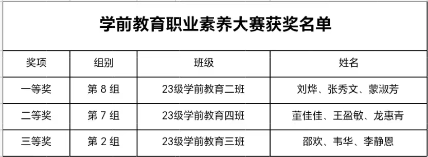 学前教育职业素养大赛获奖名单