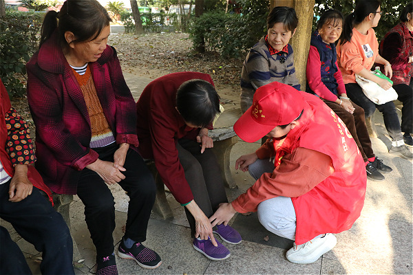 活动伊始,养生保健专业袁丽娟老师针对中老年人的健康养生需求,结合中老年人的特点,用通俗易懂的语言从劳逸结合、合理饮食、娱乐活动、经络穴位药等几个方面进行了生动形象的宣讲养生知识。针对季节变化,老年人多发病的问题,她手把手教大家找穴位,进行推拿、按摩等方式,达到舒经理络、交通阴阳、驱邪治病的作用。志愿者们也积极和老人家交流,给他们进行锤背捏肩穴位按摩。参加活动的居民们饶有兴趣地边听边学边交流,现场气氛活跃。
