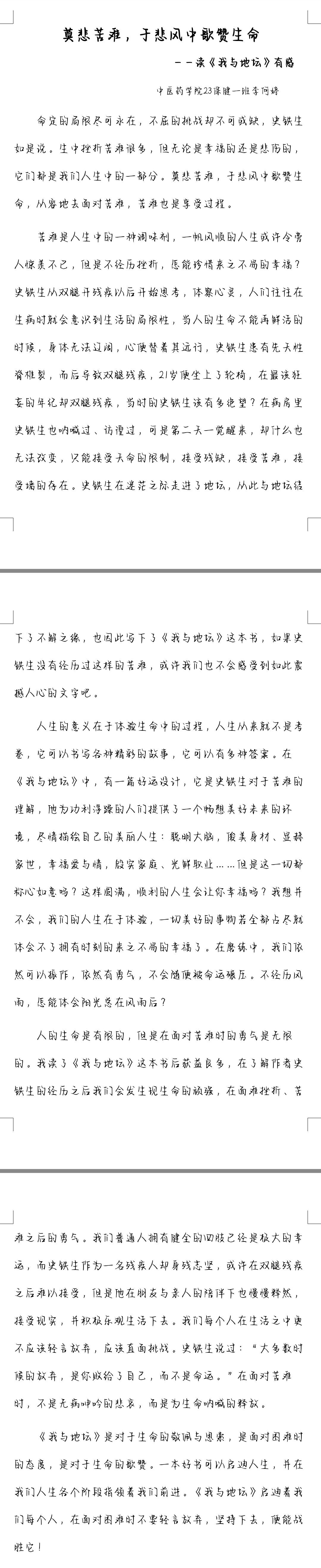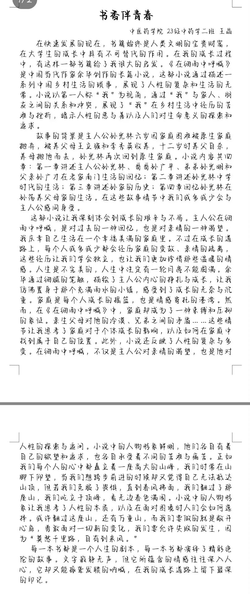 在此次活动中,中医药学院的学子都踊跃报名并积极参与此次活动。同学们通过征文的形式,向广大青年学子分享对自身影响最为深远的一本书籍,叙述书籍于自我成长之路上的助力,以及书籍带给自己在成长路上的种种感悟、收获与启示。字里行间皆流露出他们对书籍的喜爱与感激之情,深刻展现了中医药学院学子于阅读中成长、在成长中阅读的精神风貌。