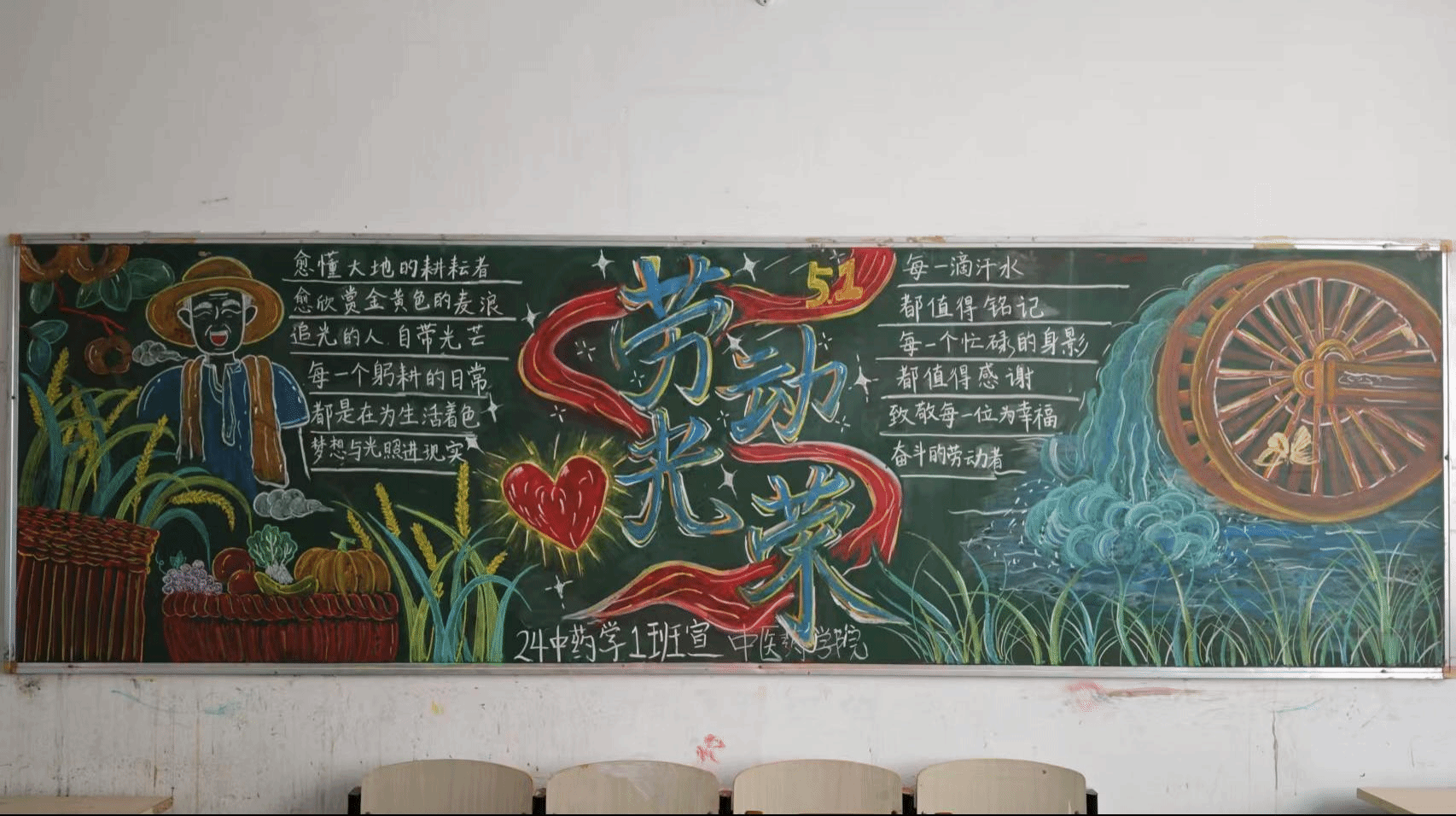 活动启动后,各班级积极响应,迅速组建创作团队,围绕主题展开创意设计。同学们以粉笔为媒、以黑板为卷,将劳动精神与艺术灵感巧妙融合。经过半个月的精心创作,一幅幅主题鲜明、构思新颖、色彩生动的黑板报作品在校园中精彩呈现,既展现了青年学子的蓬勃朝气,也传递了对美好未来的无限憧憬。4月15日,学院组织评委组从主题契合度、创意表现力、视觉美感、团队协作等维度对作品进行综合评审。最终,24中药学1班荣获一等奖;24保健2班、24制药2班获得二等奖;24中草药1班、24五年制药2班、24保健1班分获三等奖。