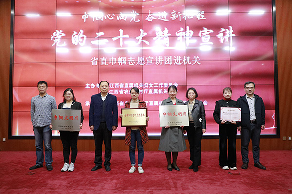 省直巾帼志愿宣讲团成员、省委党校讲师张志芳以“新思考引领新发展 新使命开启新征程”为题,围绕新思想、新使命、新部署,从“引领过去五年的工作和新时代十年的伟大变革、新时代新征程中国共产党的使命任务、新时代新征程中国共产党的工作部署”三个方面,对党的二十大精神进行了深入浅出的解读。省直巾帼志愿宣讲团成员、全国三八红旗手钟玲同志讲述“农业农村巾帼一心向党,做好农业丰收‘卫士’,让中国人的饭碗装更多江西粮”的感人故事,展示勤耕不辍守初心、履职尽责为“三农”的巾帼农业人情怀。