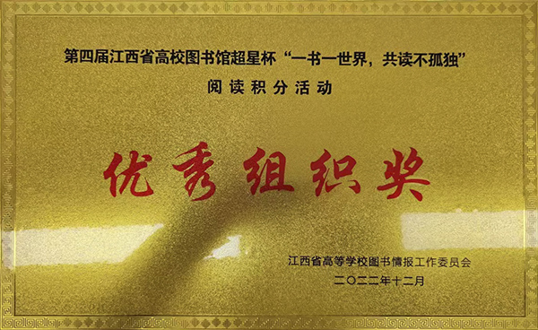 根据近期赣教图【2022】14号(通知),我院图书馆携手师生共同努力,荣获第四届江西省高校图书馆超星杯‘一书一世界,共读不孤独’阅读积分活动优秀组织奖,这是我院首次获得该荣誉。