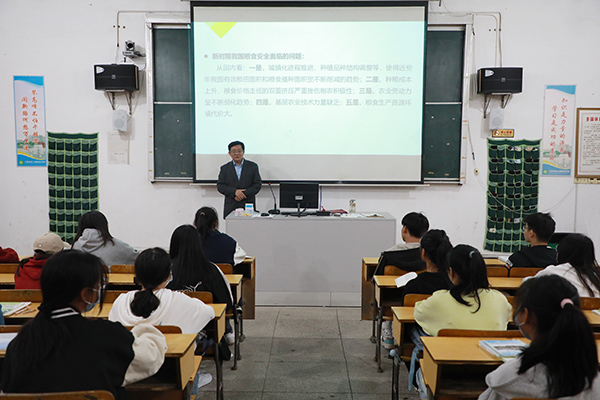 仓廪实,天下安,粮食事关国运民生,粮食安全是国家安全的重要基础。课上,张新春以《为实现新时期国家粮食安全担当使命》为题,从习近平谈粮食安全重要论述、如何实现粮食安全以及为保障国家粮食安全勇担使命三方面深刻阐述了粮食安全的重要性。立足于新时期我国粮食安全面临的问题,逐步引导学生思考如何保障粮食安全。一个个鲜活的事例、一幅幅生动的图片、一组组真实的数据使同学们更加深刻理解了粮食安全的重要性。