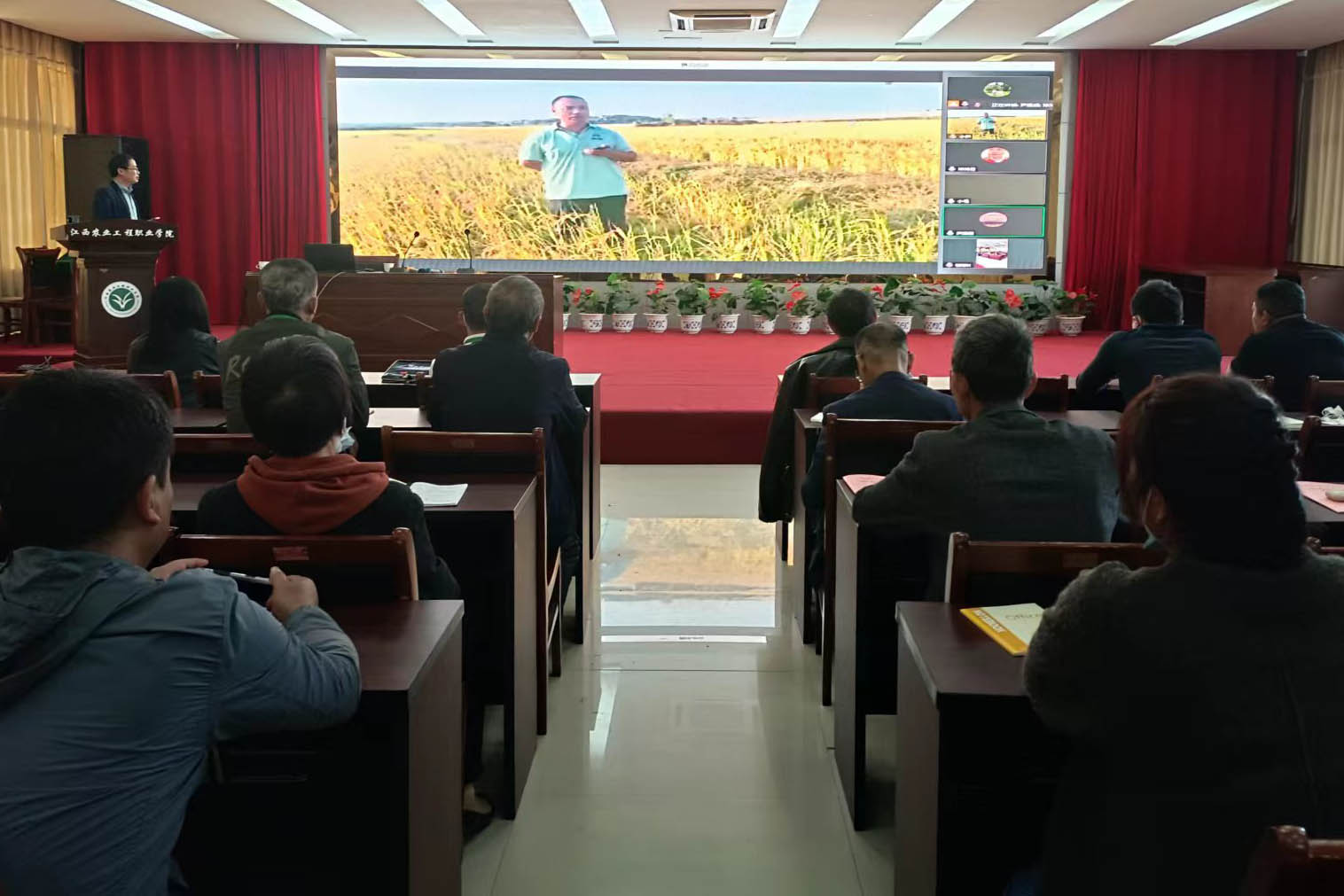 “秧苗插下去15天后,在水田里放养鸭苗,水稻抽穗前,鸭子就长大了,必须离开稻田出栏……”11月1日,在学院培训教室的大屏幕上,一个身材魁梧、皮肤黝黑的农民正站在金黄的稻田中央进行网络直播,将稻鸭共养技术娓娓道来。他就是省家庭农场联合会樟树市分会会长尹建超。2022年江西省高素质农民培育家庭农场主培训2班线上线下100余名学员通过网络直播软件进行了云端实践学习,观摩了稻鸭共养基地。
