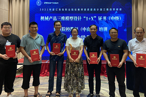 为贯彻落实《中共中央国务院关于全面深化新时代教师队伍建设改革的意见》和《关于在院校实施“学历证书+若干职业技能等级证书”制度试点方案》的精神,顺利开展机械产品三维模型设计“1+X”证书(中级)证书试点工作,8月4日~10日在安徽合肥举办了由江西省教育厅主办、九江职业技术学院承办、广州中望龙腾软件有限公司提供技术支持的2021年度江西省职业院校教师素质提高计划三教改革研修--机械产品三维模型设计“1+X”证书(中级)试点院校教师培训班。机电工程学院黄贵清和杨丹二位老师参加了本次培训,并通过了职业技能考评员和师资资格考试,获得了考评员资格和1+X培训讲师证书。全省共计21所职教本科、高职、中职院校的老师代表参加了培训。