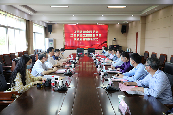 签约式中,张新春代表学院对江西省双金园艺场一行的到访表示热烈的欢迎,杨帆、李水星分别介绍各自单位基本情况,并现场进行校企合作协议的签订。江西省双金园艺场党委书记付小文、学院党委书记张新春分别讲话,张新春提出三点建议:第一,组建校企合作工作专班。第二,形成定期工作例会制度,推动合作相关事宜。第三,按照校企合作、产教融合的思路,本着平等互利、资源共享、携手共进的原则共同谋划具体合作项目,力争在具体项目落地后尽快见成效。