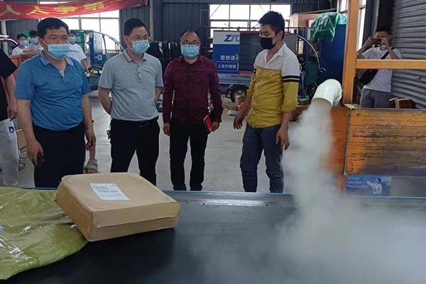 所到快递周转中心,负责人热情接待,并带领参观、介绍了整个快递件卸车、消毒、分拣的全过程。快递物流车辆到达周转中心后,一条传输带直通物流车车厢内部,将快递件接出来,紧接着,一个雾化消毒水的喷射装置在等待着它们,快递件依次通过消毒水的“沐浴”后,才进入分拣流水线。考察组对消毒所使用的消毒设备、消毒液的情况进行了详细的了解。