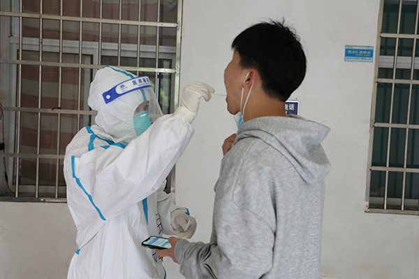 4月12日上午,烈日当空,在学院第二次全员核酸采样篮球场采样现场,长长的队伍前方坐着一位被防护服包裹严实的医务人员。“摘下口罩,把头抬起来一点,张开嘴巴,一会儿就好”那位医务人员一边说,一边捏着一次性采样拭子伸入口腔,布满雾水的护目镜后方的眼睛一动不动地注视着前方,唯恐有所闪失,转了几圈,娴熟地完成一次采样。谁也不会想到被防护服包裹着的是一个平时笑起来像个孩子的护士——付佳婷。她不是第一次重复这样单调的话语,不是第一次重复这样机械的动作。