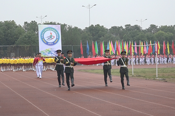 下午3时整,在激昂的《运动员进行曲》中,国旗队、会徽队、鲜花队、彩旗队、志愿者方阵、运动员方阵、裁判员方阵、迈着坚定的步伐,依次走过主席台,接受领导检阅。