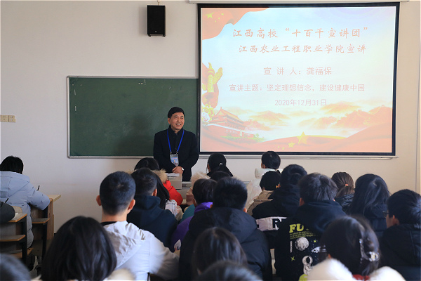 上午9:50时,龚福保来到20级中草药1班,以《坚定理想信念 建设健康中国》为主题,宣讲党的十九届五中全会精神。他寄语新时代的大学生,要找准人生定位与奋斗目标,把个人际遇融入时代发展大局,以党的十九届五中全会精神为指引,以永不懈怠的精神状态和一往无前的奋斗姿态,做“十四五”时期的奋进者、开拓者、建设者,创造无愧于新时代的新业绩。作为一名中医药专业的学生,要掌握扎实的专业知识和专业技能,主动适应新时代的新要求,迎接新时代的新挑战,为健康中国建设做出应有的贡献。