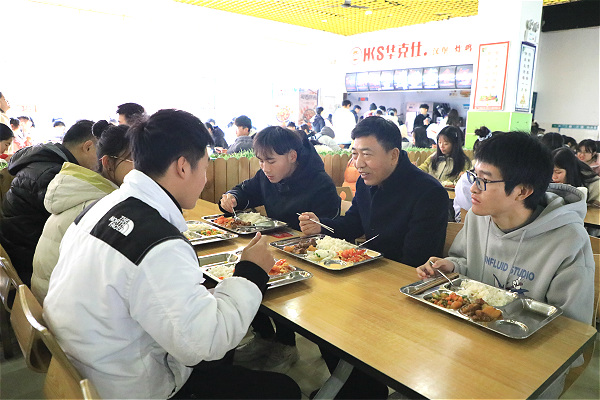 中午12:00时,龚福保与同学们一起排队买饭和用餐,了解食堂就餐情况。通过拉家常,了解同学们的学习生活状况。