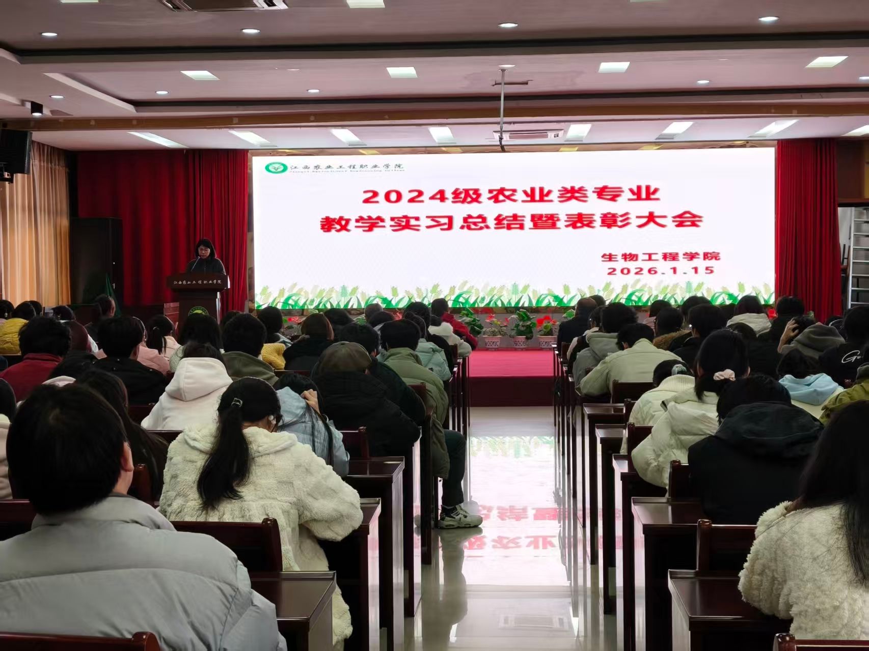 为全面复盘实习成效,表彰优秀、树立榜样,进一步深化产教融合育人模式,生物工程学院1月15日下午在多功能报告厅开展2024级农业类专业赴省双金园艺场教学综合实习总结暨表彰大会。生物工程学院实习指导教师、各班班主任、各班实习学生代表参会,共同回顾实习期间的成长与收获,凝聚继续前行的力量。