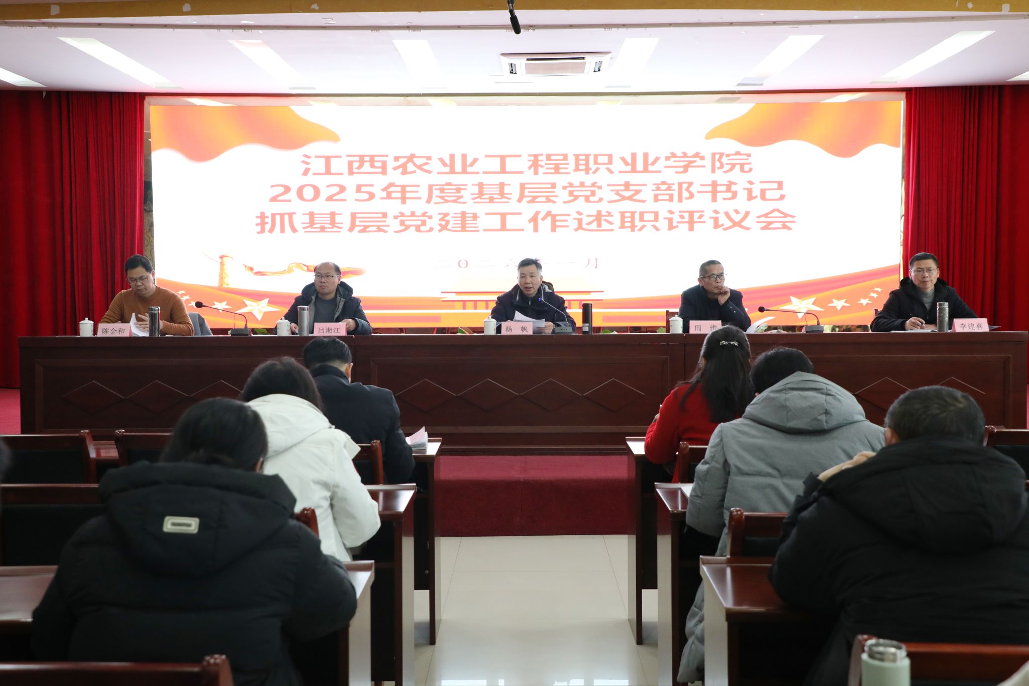 1月20日,学院党委在多功能报告厅召开2025年度党支部书记抓基层党建工作述职评议会。学院党委班子成员、各基层党支部书记、党员中层干部和党员代表参加,会议由学院党委书记杨帆主持。
