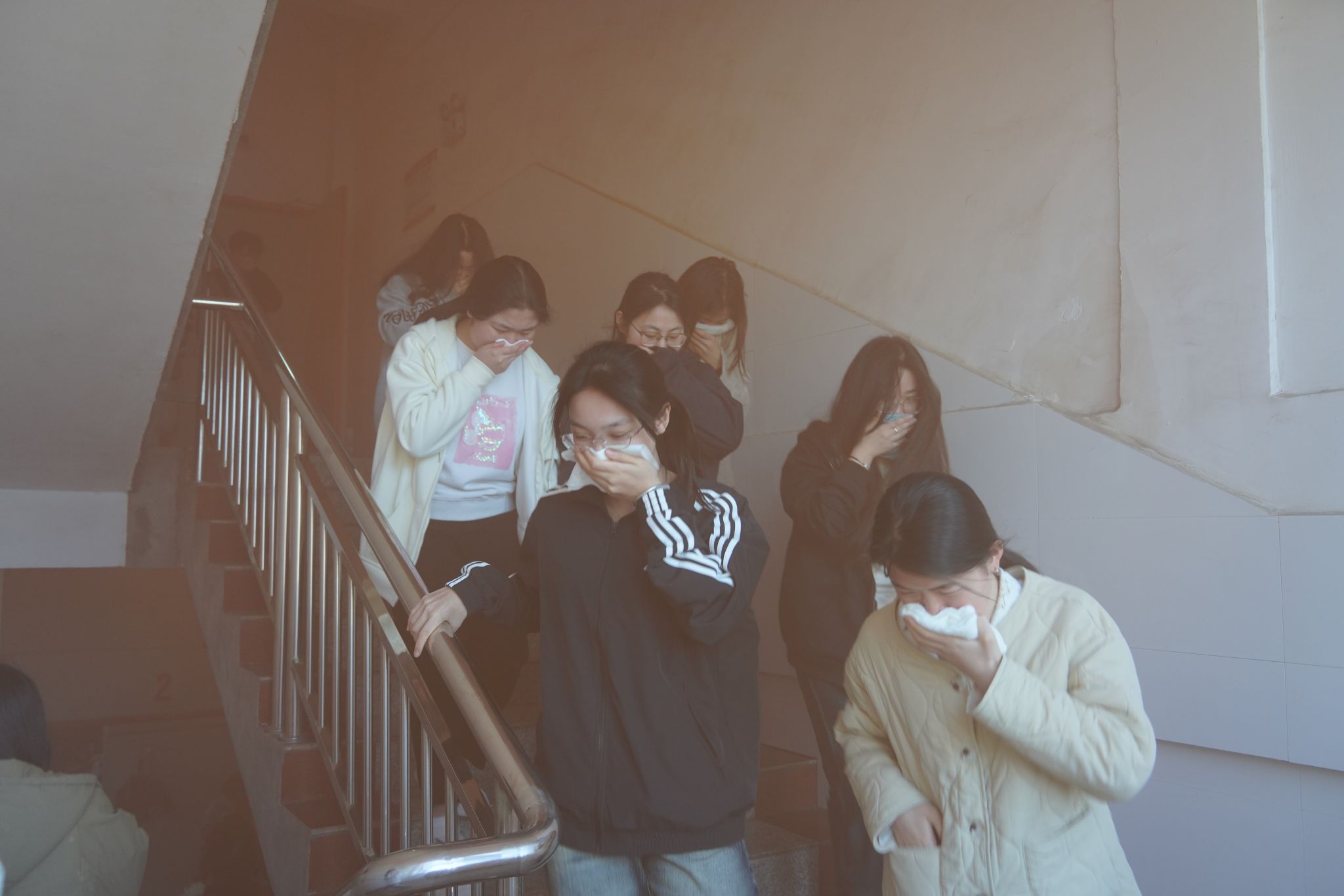演练于下午4点正式启动。随着烟雾弹燃放和应急警报拉响,同学们迅速反应,用湿毛巾捂住口鼻、弯腰低姿,在疏导员的指挥下,严格沿预定疏散路线快速、有序撤离,最终全部安全抵达空旷区域集结。
