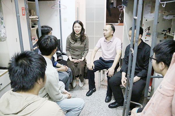 当晚八点半,许振华深入学生寝室,实地查看宿舍安全、卫生状况与生活设施,与同学们围坐交流,细致询问学业进展、生活需求、职业规划等情况,耐心解答同学们的困惑与疑问。
